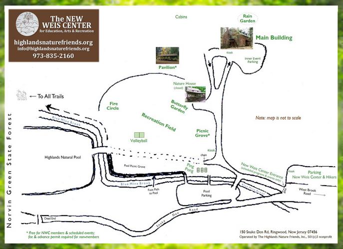 The New Weis Center is adjacent to Norvin Green State Forest, which offers over 24 miles of rugged marked trails. Starting from the New Weis Center's parking lot on Snake Den Road, hikers should follow the signs and green trail markers up Snake Den Road to access all public trails. Please bring a trail map or consult the map posted in the Warner kiosk at the entrance to Norvin Green.
