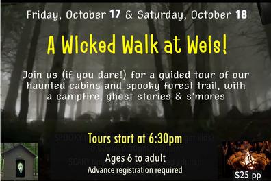 Get ready to visit our haunted cabins and make your way through a spooky forest trail - if you dare! Anyone who is a fan of ghost hunting and goosebumps is invited. We'll finish with ghost stories around a campfire and s'mores. Guided passages on the Wicked Trail will begin at 6:30pm and run every 15 minutes, with the last tour setting off at 9:15pm.